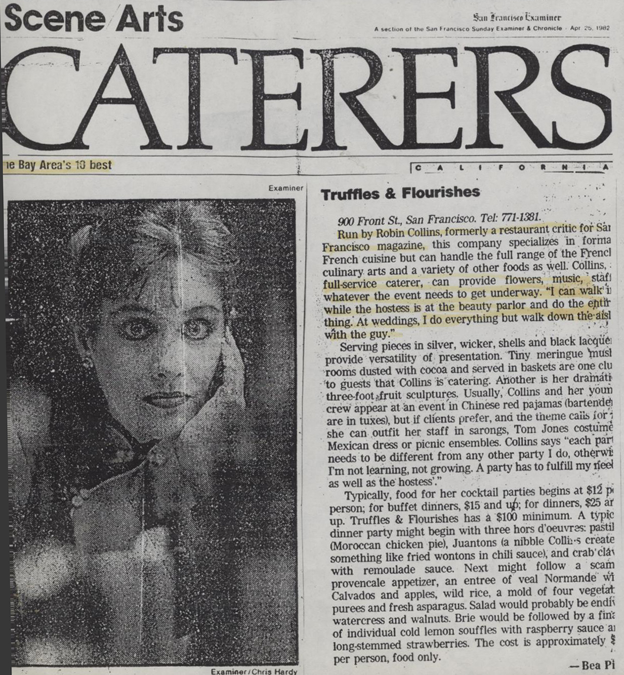 "... Robin Collins, who runs Truffles & Flourishes, one of the better catering firms..." Herb Caen, San Francisco Chronicle